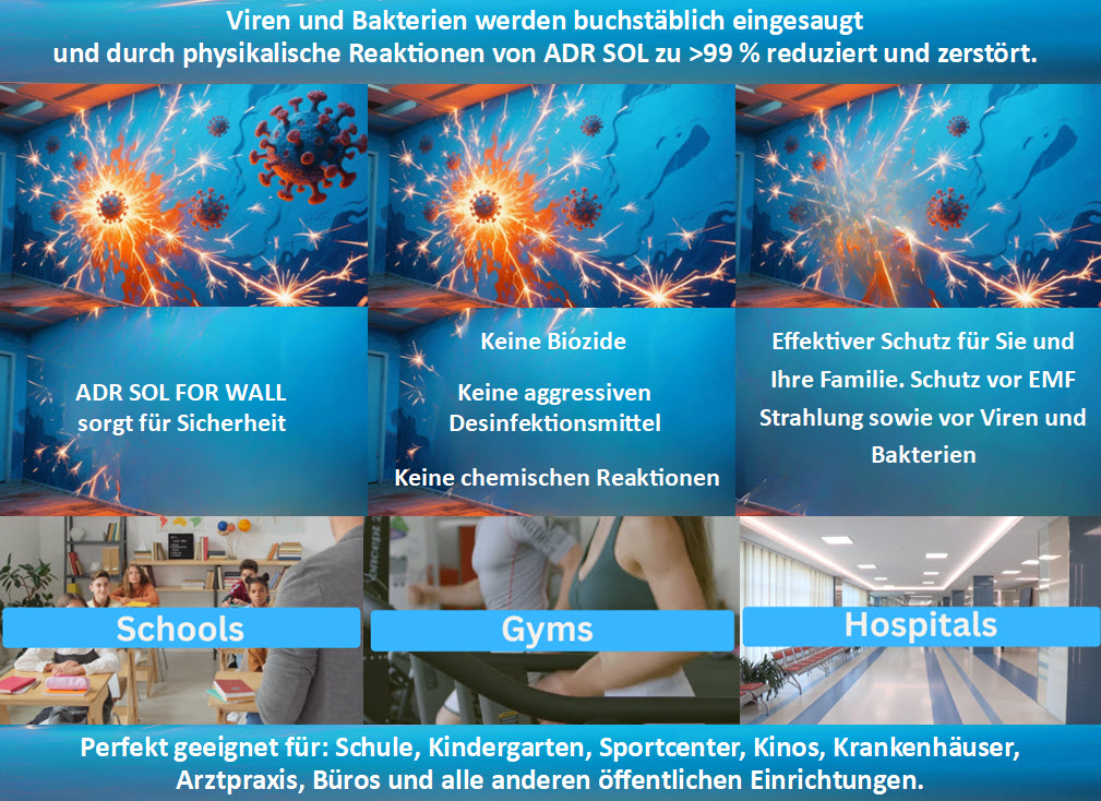 Die mit ADR SOL WALLS Imprägnierte Oberflächen reduzieren Schimmel, Pilze, Viren und Bakterienlast um bis zu 3 log (>99 %).